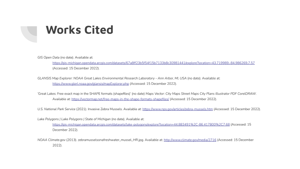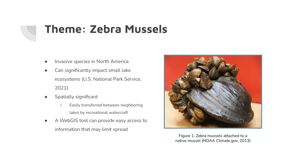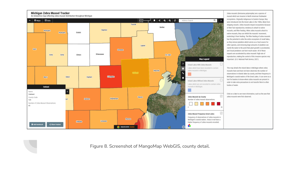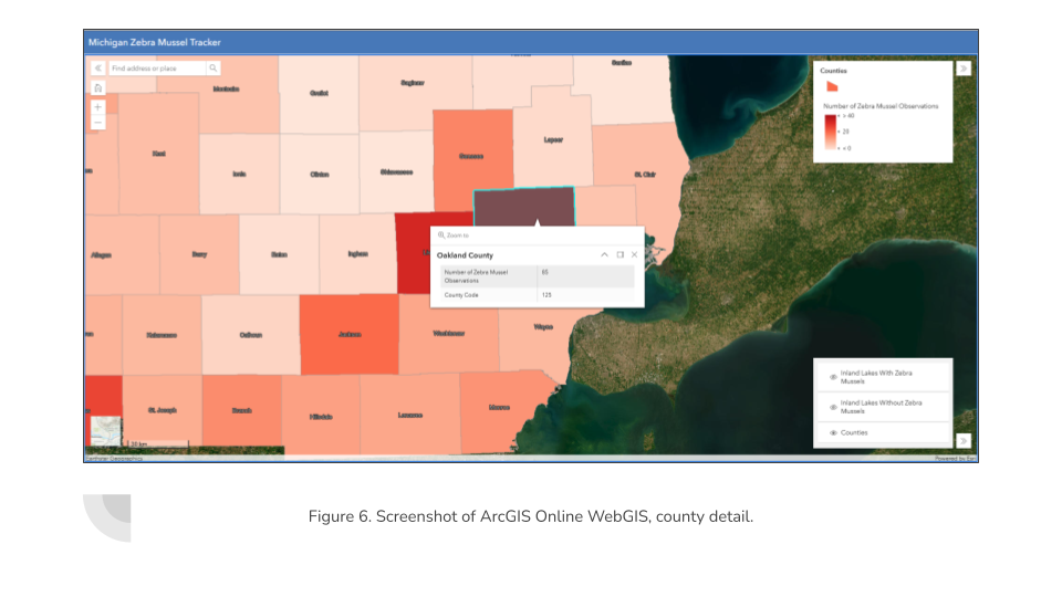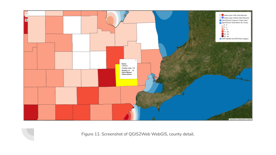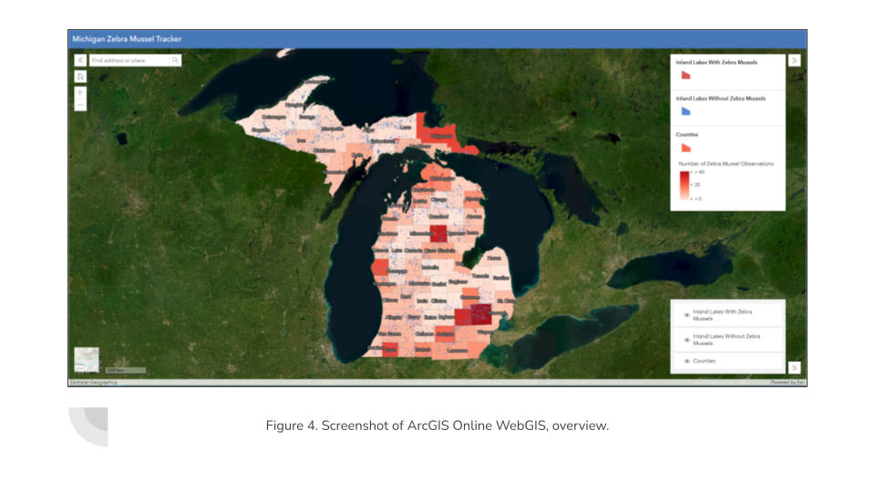 In this project I developed a WebGIS tool which shows zebra mussel spread in Michigan, and implemented it in ArcGIS Online, MangoMap, and QGIS2Web. (ArcGIS Online version available at http://www.arcg.is/1bTiOL)